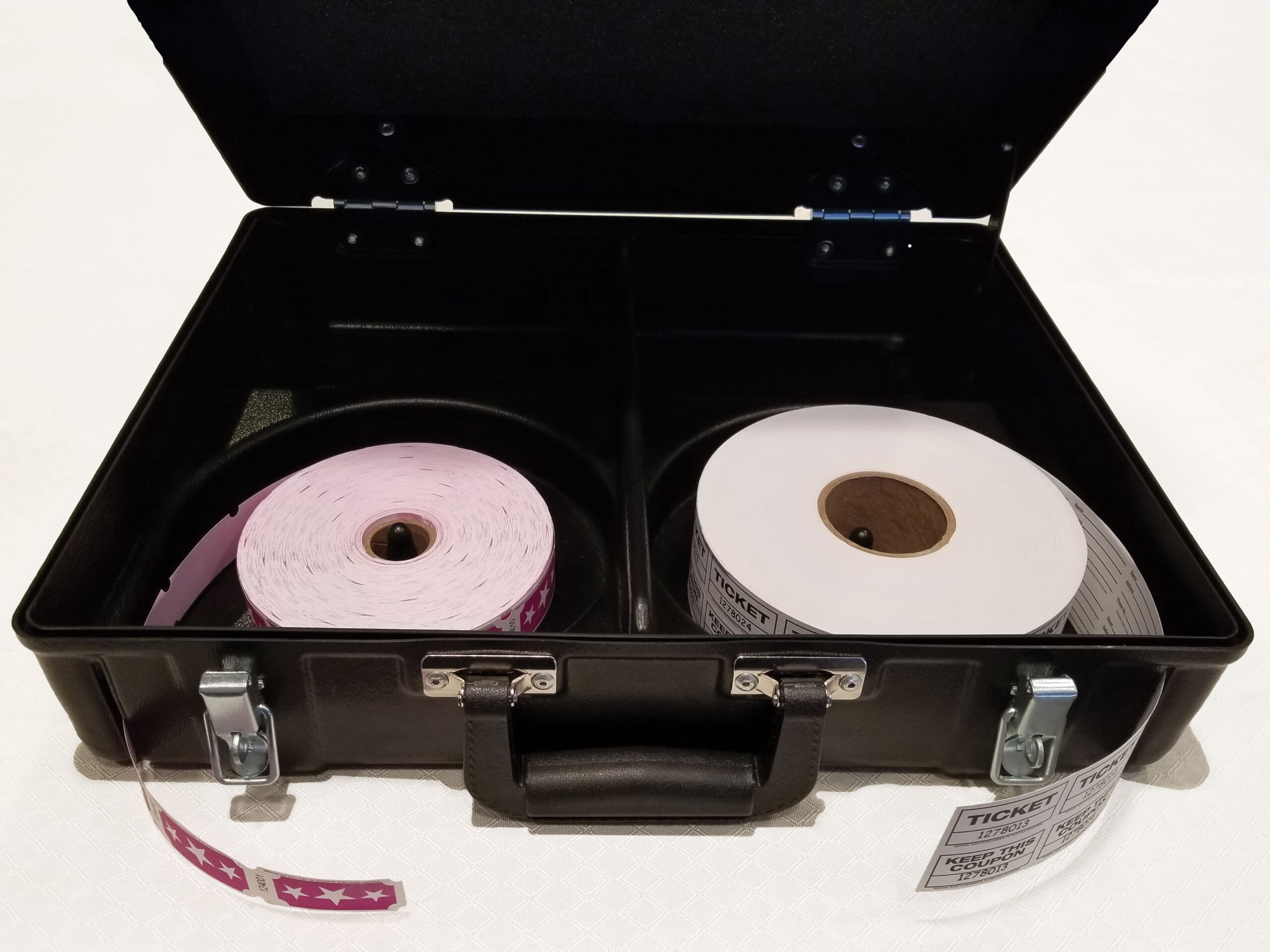 Our cash ticket box is the easy, portable way to keep your cash and roll & raffle tickets organized. Beneath the removable cash and coin tray, up to four single rolls or two double rolls of 1″ x 2” tickets can be stored and easily dispensed through slots. The spring loaded bill compartments hold bills securely in place and the padded cover holds your change in place. Made of durable, black ABS plastic, our cash ticket box comes with 2 latches which can be locked to secure profits (lock not included). Ships next business day!